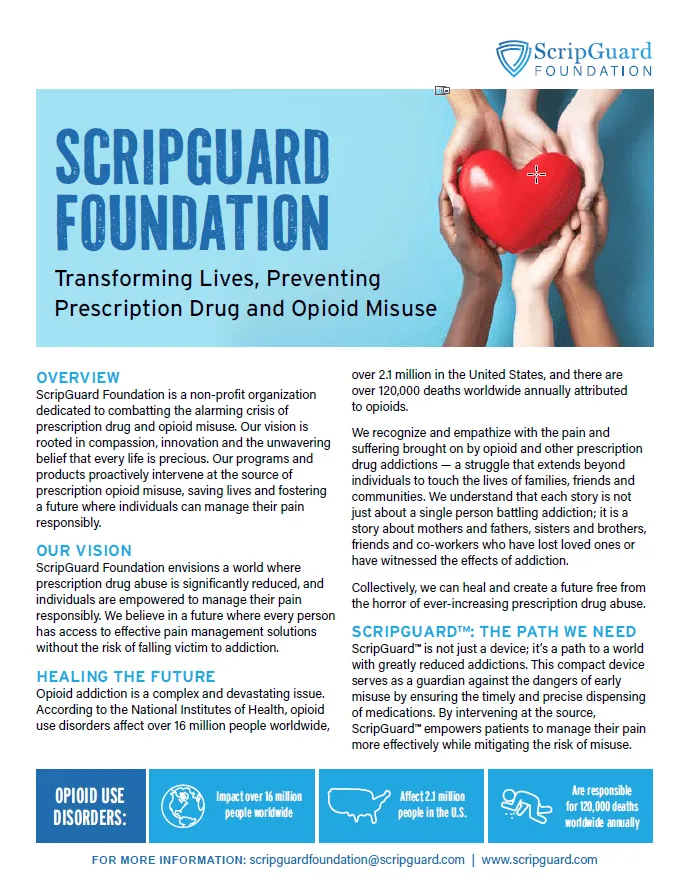 ScripGuard Foundation is a non-profit organization dedicated to advancing social good by addressing the alarming crisis of prescription opioid misuse. Our vision is rooted in compassion, innovation and the unwavering belief that every life is precious. Through our pioneering initiatives, we aim to proactively intervene at the source of prescription opioid misuse, saving lives and fostering a future where individuals can manage their pain responsibly. And, for those who have succumbed to opioid misuse, provide a resource for prescription misuse and addiction support.